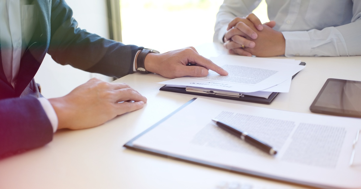 Two people are sitting at a table. One of them is pointing to something on a document on a clipboard.